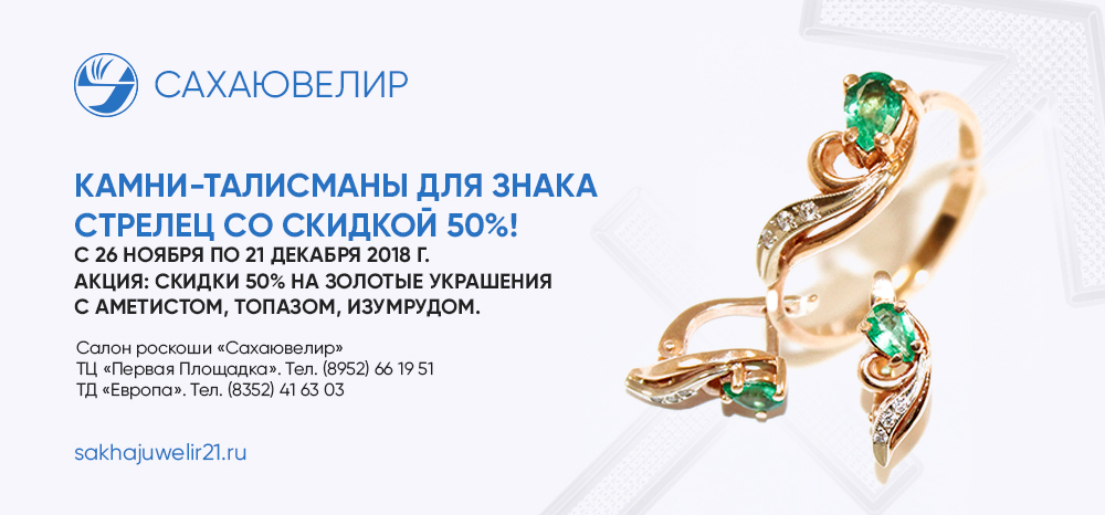 С 26 ноября по 21 декабря акция: Скидки 50% на золотые украшения с камнями: аметист, топаз, изумруд!